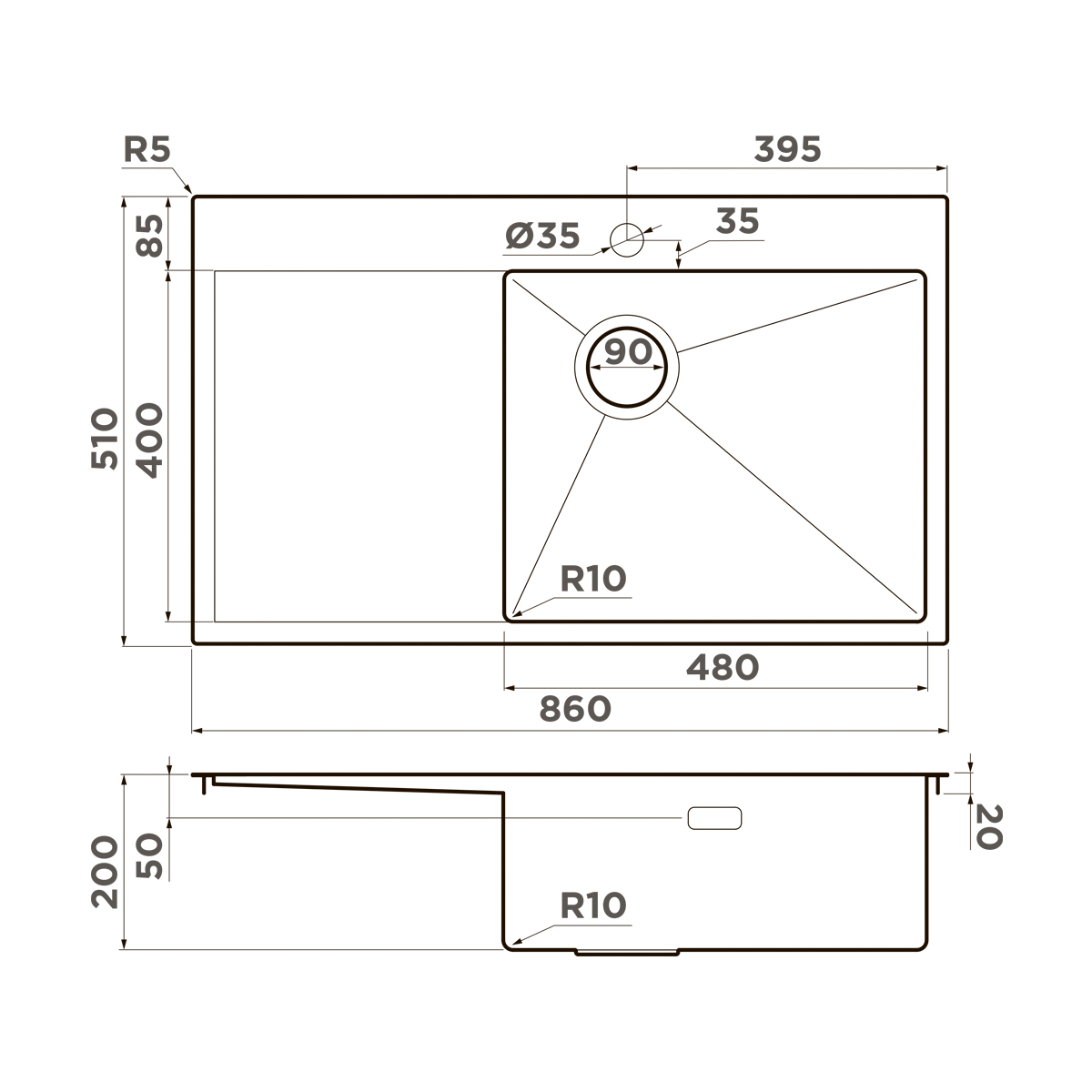 Модель Akisame 86-R Side — это одночашевая мойка из нержавеющей стали толщиной 1,2 мм, выполненная вручную по японским стандартам качества. Буква «R» означает, что чаша расположена справа, а крыло — слева, что особенно удобно для левшей или при нестандартной планировке кухни: основная зона мытья под ведущей рукой, а левое крыло служит для сушки посуды, нарезки овощей или временного хранения.