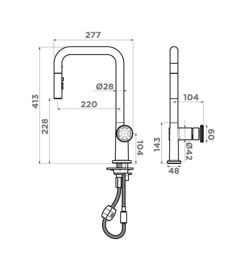 Вытяжной шланг обеспечивает удобство использования смесителя, которое заключается в возможности мытья труднодоступных мест и бережной очистке мелких столовых приборов. С его помощью также можно тщательно промывать овощи, фрукты и посуду после мытья без лишних брызг на столешницу вокруг мойки.