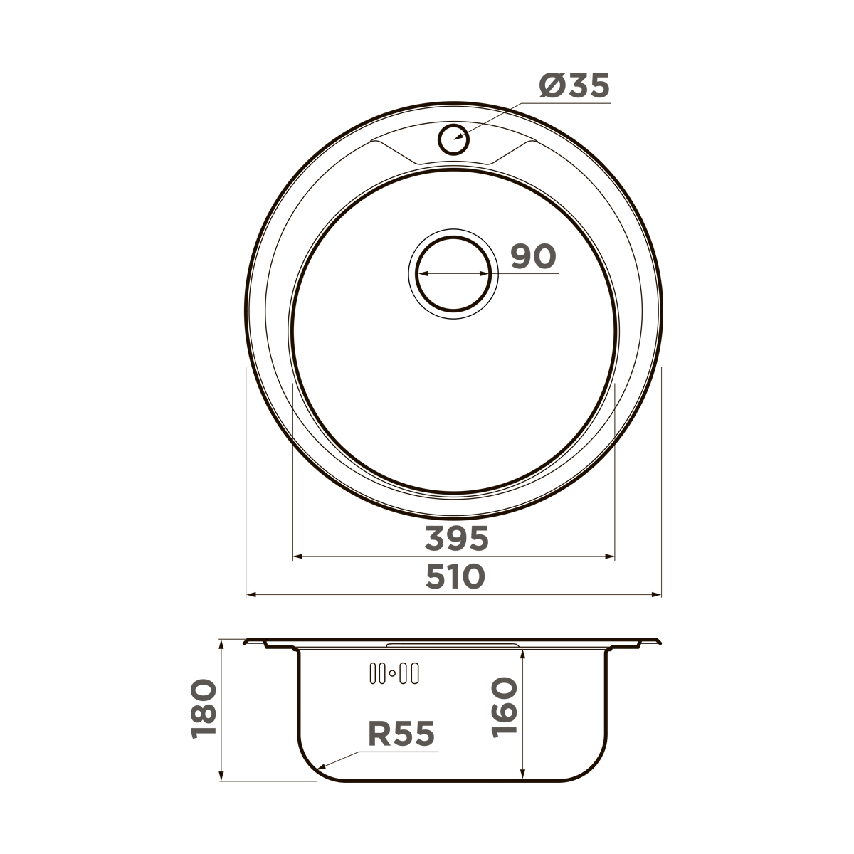 Благодаря габаритам 510 × 510 мм и глубине чаши 160 мм, мойка идеально вписывается в тумбу с базой 45 см, не занимая лишнего места, но при этом сохраняя функциональность для повседневного использования. Крыла нет — это делает модель особенно популярной в минималистичных интерьерах и узких гарнитурах.
