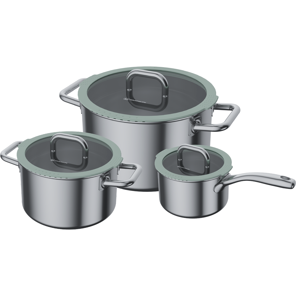 В комплект входят: ковш с антипригарным керамическим покрытием на 1,8 л, кастрюли 3,4 и 5,8 л. Крышки выполнены из закаленного стекла, это позволяет следить за процессом готовки, не открывая крышку, тем самым сохраняя тепло и ароматы внутри.