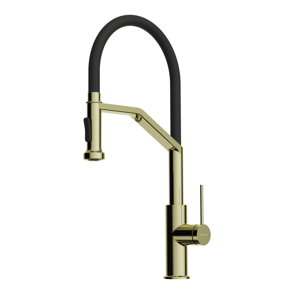 Makkari 2 Plus-SB светлое золото один из самых функциональных и удобных в использовании смесителей Omoikiri. Он довольно высокий, 528 мм, но при этом отлично подходит для размещения на стандартной кухне, которая имеет верхний ряд навесных шкафов и стандартную высоту фартука в 60 см. Так как, чтобы воспользоваться гибким изливом, его не нужно поднимать вверх, а всего лишь легким движением снять с магнитного держателя, просто потянув на себя.