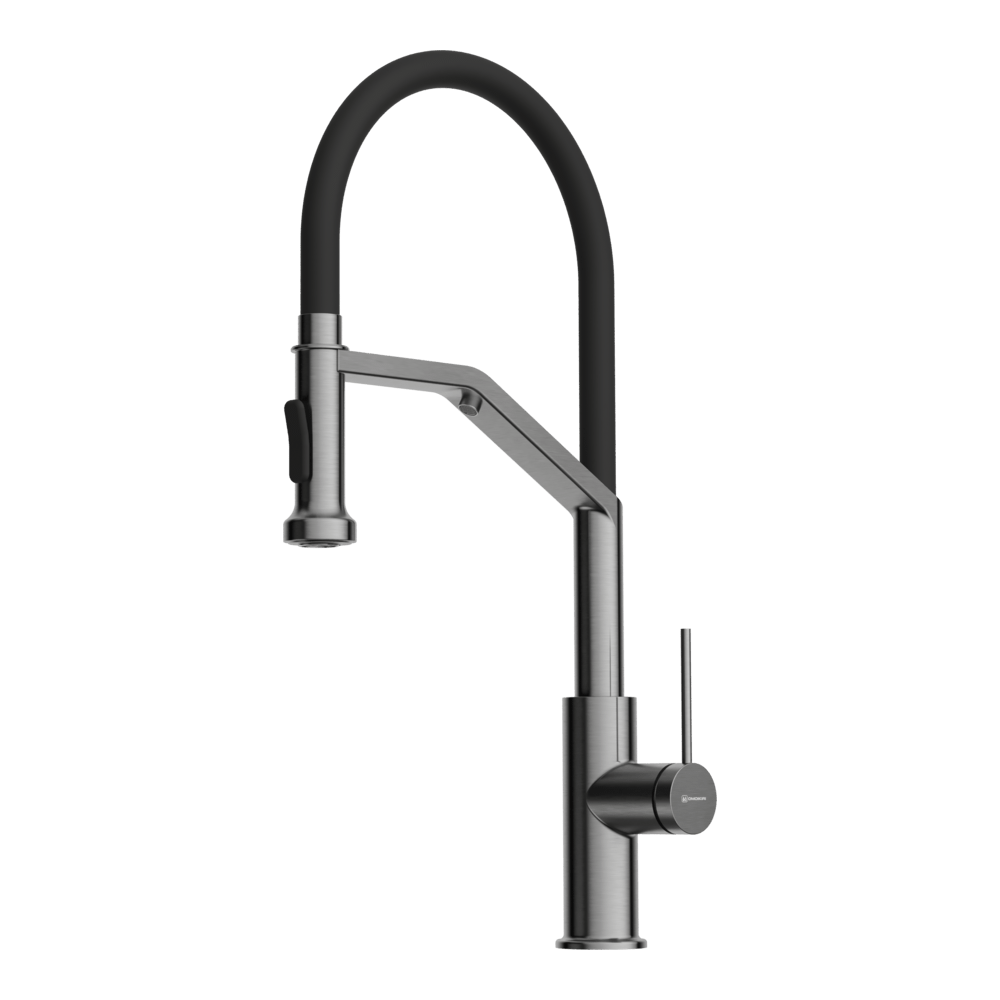 Makkari 2 Plus-SB вороненая сталь один из самых функциональных и удобных в использовании смесителей Omoikiri. Он довольно высокий, 528 мм, но при этом отлично подходит для размещения на стандартной кухне, которая имеет верхний ряд навесных шкафов и стандартную высоту фартука в 60 см. Так как, чтобы воспользоваться гибким изливом, его не нужно поднимать вверх, а всего лишь легким движением снять с магнитного держателя, просто потянув на себя.