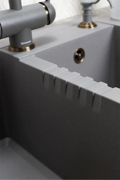 Мойки из Tetogranit устойчивы к механическим повреждениям. Кварцевый песок в составе мойки имеет кристаллическую структуру, гарантируя неизменность внешнего вида мойки и ее безопасность. За счет плотной структуры материала мойки имеют гладкую и ровную поверхность, с которой легко убираются загрязнения при помощи обычной влажной губки.