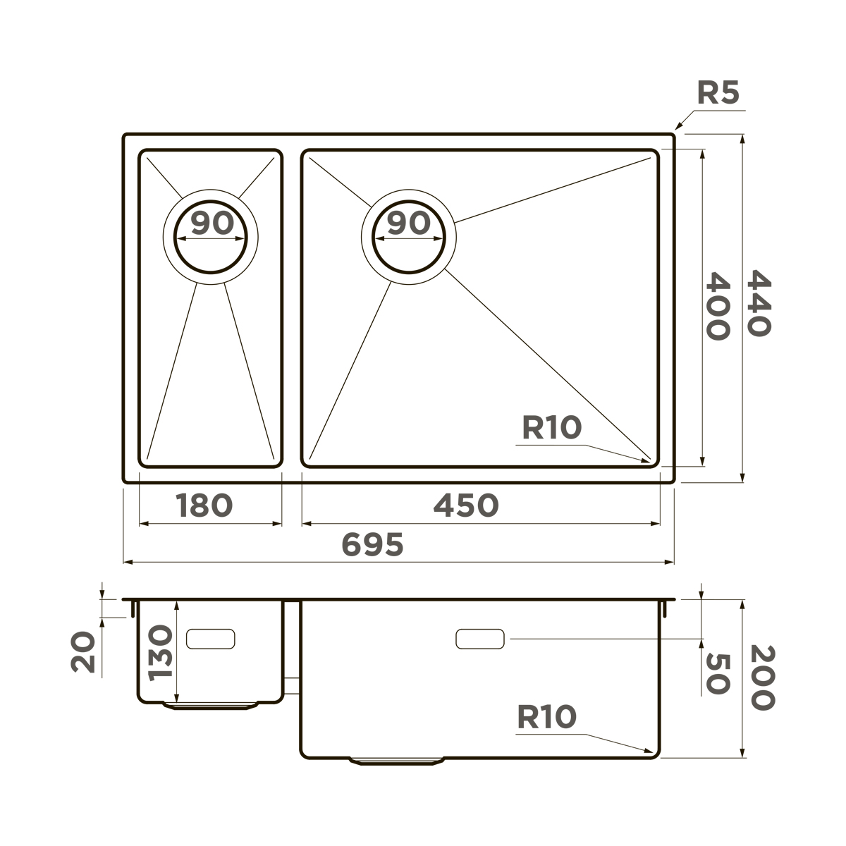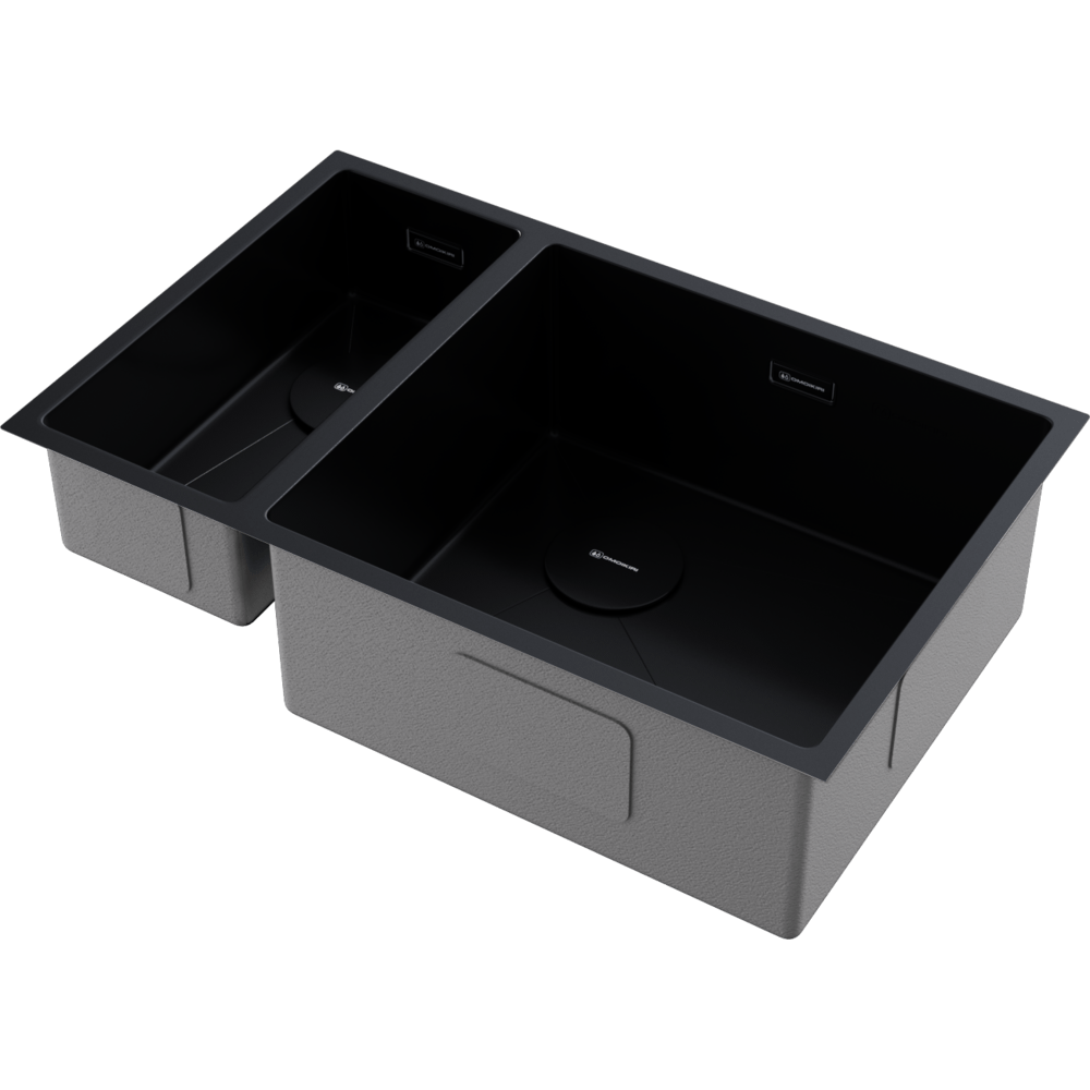 С общей шириной 750 мм и глубиной чаш 200 мм, эта мойка идеально подходит для больших и функциональных кухонь. Основная (правая) чаша размером 450 × 400 мм легко вмещает крупную посуду, противни и кастрюли, а левая — удобна для ополаскивания, разморозки или временного хранения продуктов.