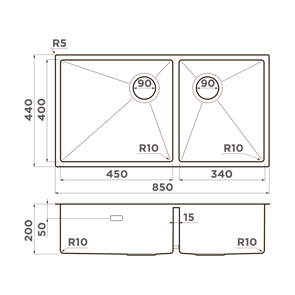 Обозначение «Side» указывает на смещённое вбок сливное отверстие — это освобождает центральное пространство под мойкой, позволяя без проблем установить измельчитель отходов, систему фильтрации воды или контейнеры для раздельного сбора мусора.