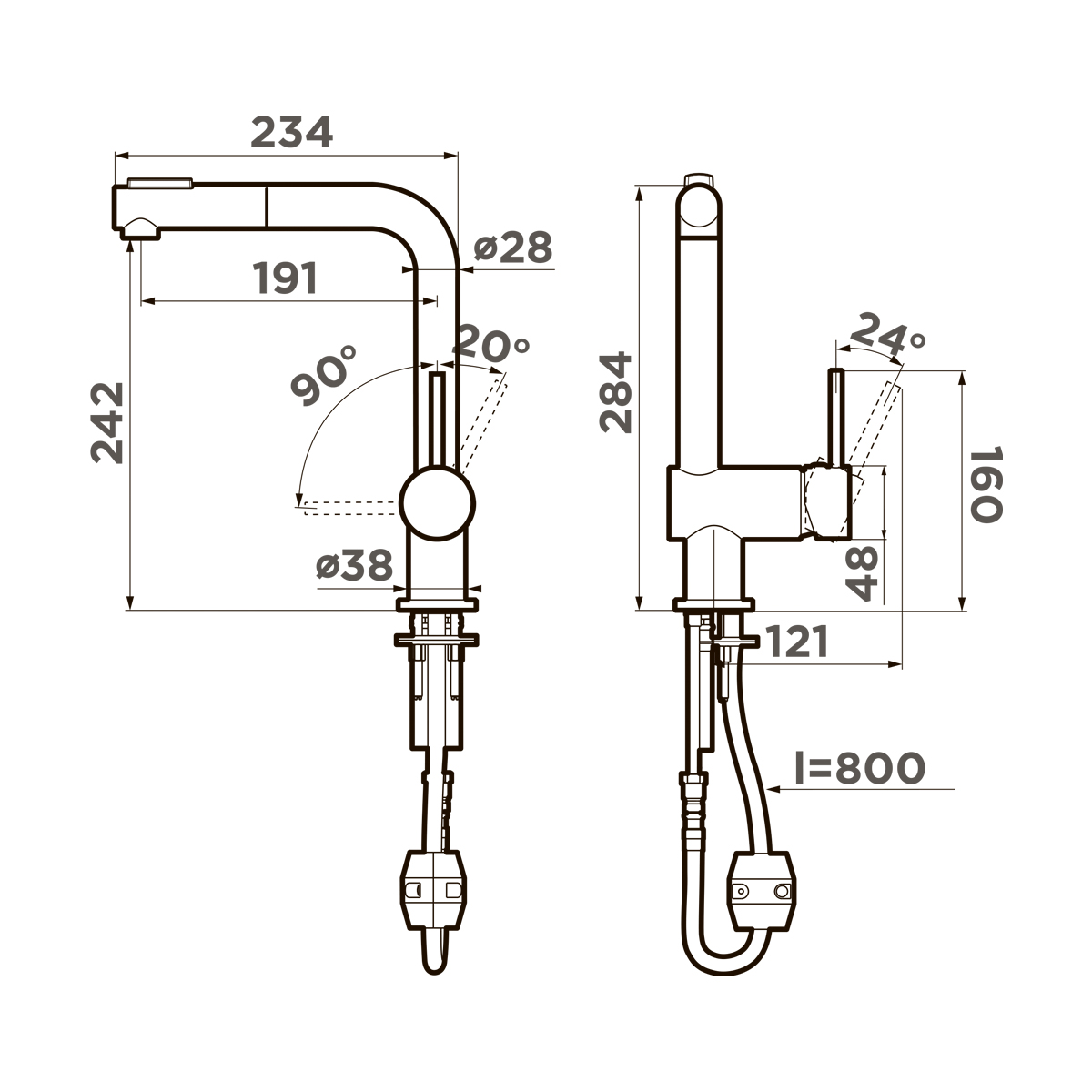 Вытяжной шланг обеспечивает удобство использования смесителя, которое заключается в возможности мытья труднодоступных мест и бережной очистке мелких столовых приборов. С его помощью также можно тщательно промывать овощи, фрукты и посуду после мытья без лишних брызг на столешницу вокруг мойки.
